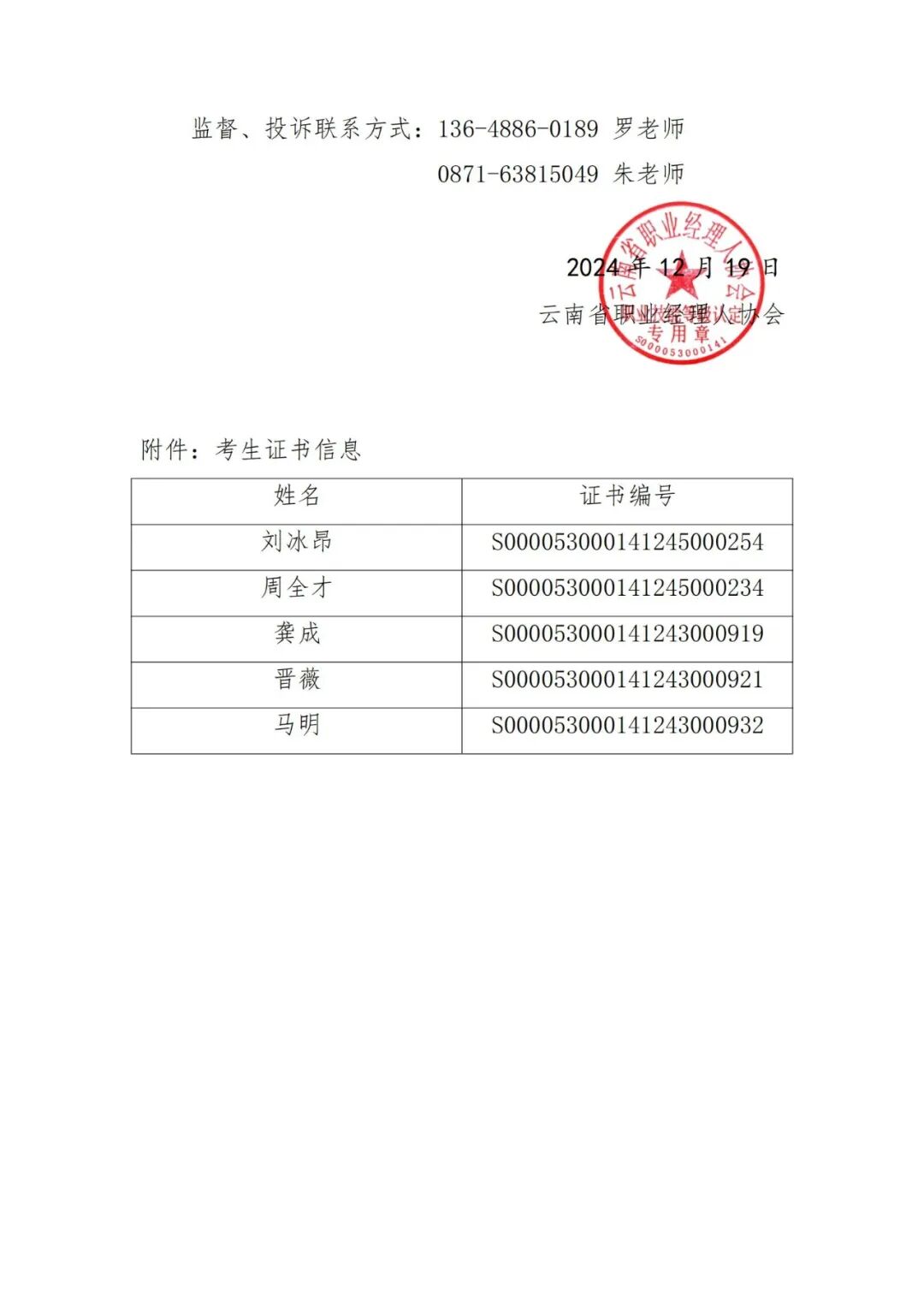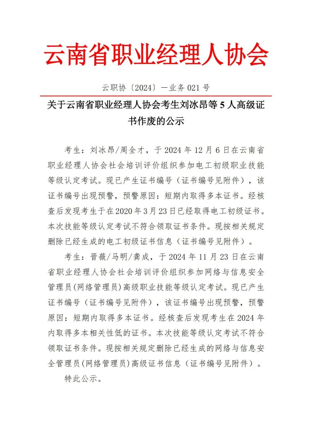 关于云南省职业经理人协会考生刘冰昂等 5 人高级证书作废的公示