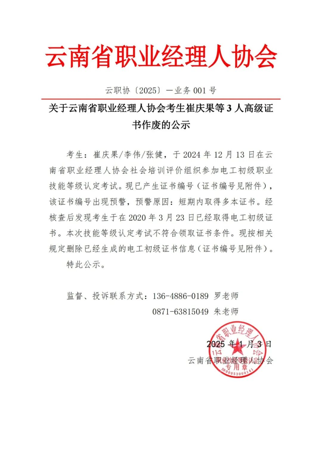 关于云南省职业经理人协会考生崔庆果等 3 人高级证书作废的公示